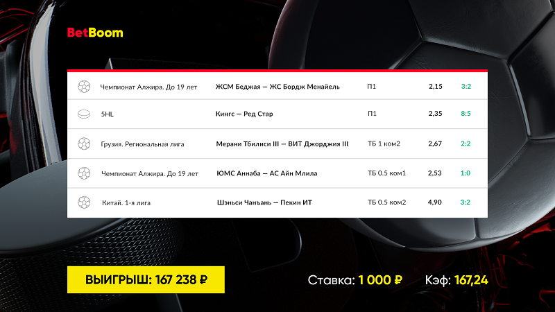 Мидвик выдался достаточно успешным для одного из клиентов BetBoom – беттор собрал экспресс из пяти событий с коэффициентом 167,24, поставив на него 1000 рублей. Сумма выигрыша составила 167 238 рублей!